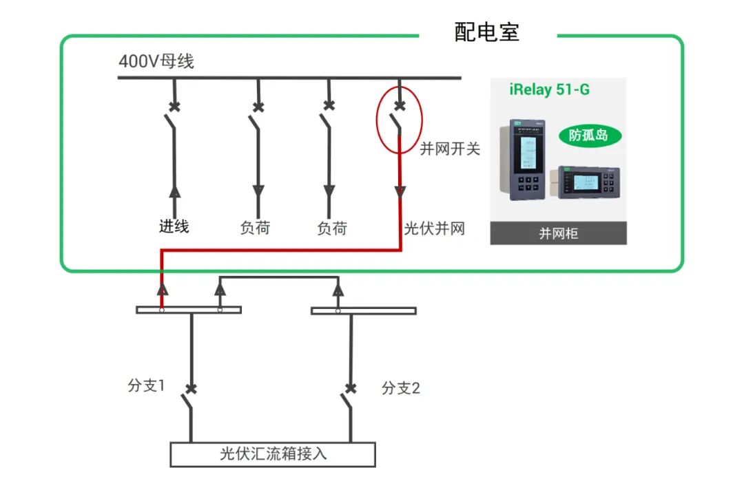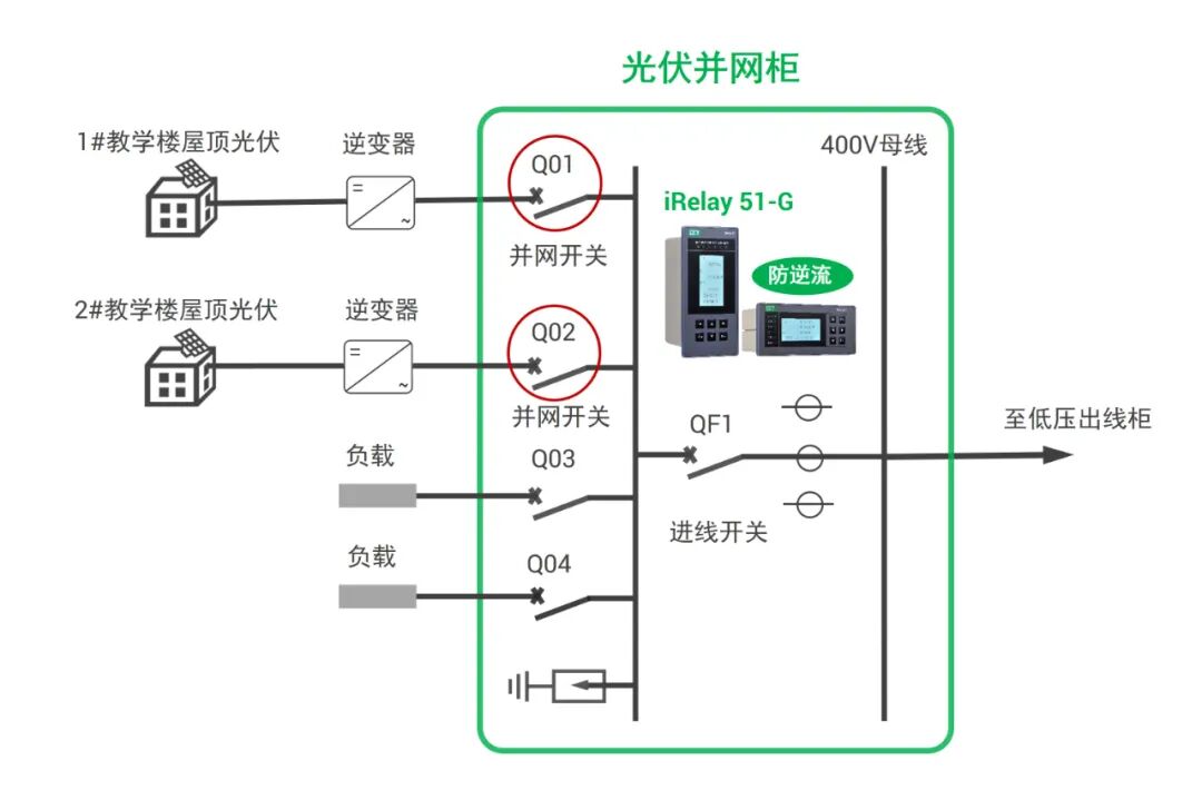 iRelay 51-G具有逆功率保護功能,無需電壓互感器可直接接入400V光伏并網(wǎng)計量柜,當并網(wǎng)開關(guān)出現(xiàn)逆流,iRelay 51-G會監(jiān)測到逆功率并觸發(fā)保護動作,選擇跳開Q01并網(wǎng)開關(guān),降低發(fā)電功率;如果iRelay 51-G再次監(jiān)測到逆功率,便會觸發(fā)保護動作跳開Q02并網(wǎng)開關(guān),避免發(fā)生電網(wǎng)逆流,保證全部發(fā)電自發(fā)自用。